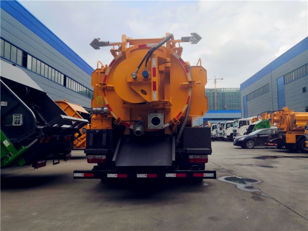 吸污部分:7方污罐,罐體6mmQ235優質碳鋼,配淄博SK-12水循環泵,8米吸污管一根,進氣管加過濾網,防溢閥加高,后蓋卡扣鎖緊,前視污亮管,后尾部加裝1個力拓牌**mm的球閥吸污口150mm排污口,罐體帶舉升功能,后門帶液壓開啟。