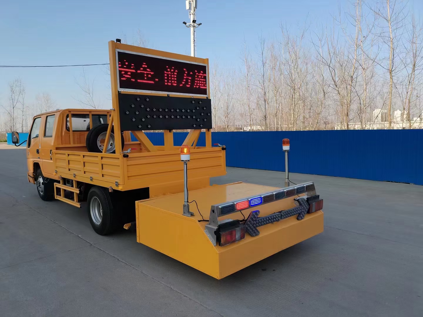 該車還配備車載一體化的電子屏:1600/480mm。電子箭頭標志牌、頻閃燈及爆閃燈多種**示燈,能夠為后方車輛提供**示和指示方向。箭頭指示標志可對左、右及禁止通行進行導向指示對道路車輛提供主動安全引導和安全**示,**限度降低施工對**流量的影響井確保安全。尾部升降和燈具采用遙控**,可在車輛附安全**防撞緩沖塊的升降和**示燈的開關。